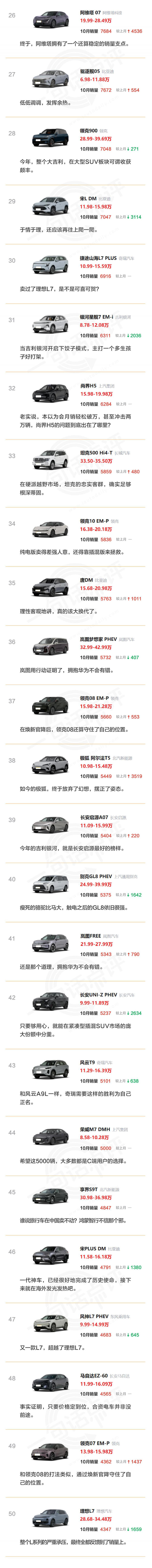 当然,如果试图评选 10 月该板块最失意的一位选手,肯定非理想莫属。碍于 L 系列疯狂被竞品围攻与撕咬,曾经那个大杀四方的阶段一去不复返了。