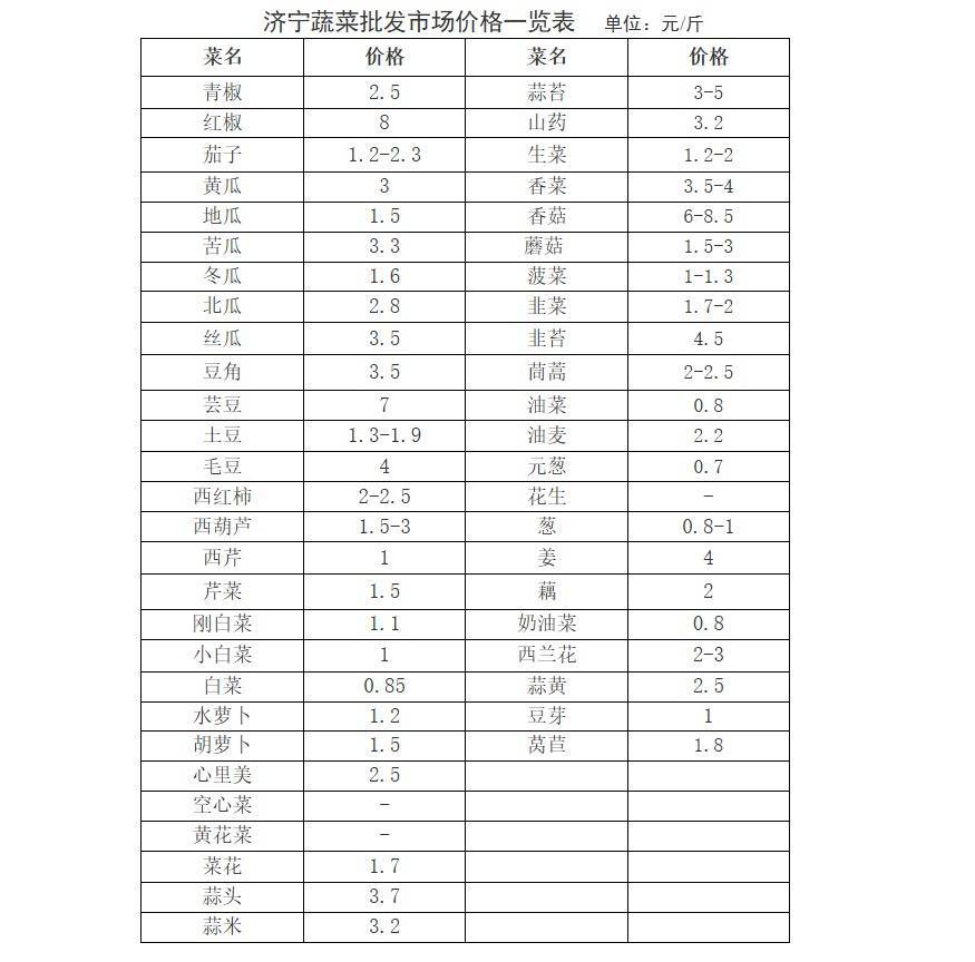 3月14日,大众网记者在济宁市农业农村局发布的《济宁最新蔬菜批发市场价格一览表》中了解到济宁市最新菜价,其中,葱姜蒜分别为0.8-1元、4元和3.7元每斤。具体如下:
