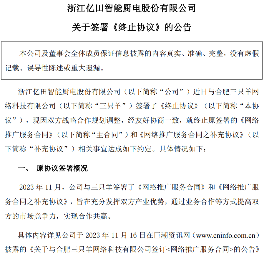 根据公告披露,亿田智能与三只羊于2023年11月签署《网络推广服务合同》及补充协议,旨在通过业务合作提高双方市场竞争力,实现合作共赢。该合作在当时被视为传统制造企业拥抱新零售渠道的典范,引发市场广泛关注。